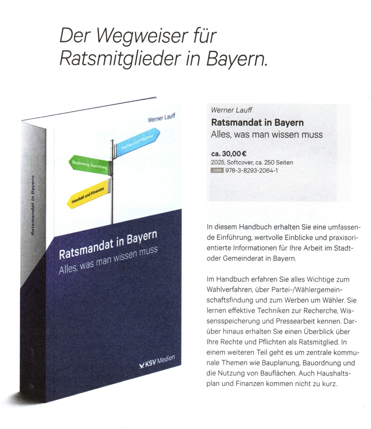 Erscheint rechtzeitig zur Kommunalwahl 2026: Der Wegweiser für Ratsmitglieder in Bayern. Von Werner Lauff. Erkenntnisse und Ratschläge aus 13 Jahren journalistischer Beobachtung. Verlag KSV Medien, Wiesbaden