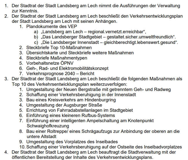 Der Stadtrat hat die Empfehlung der Bürgerversammlung mit 19 zu 5 Stimmen abgelehnt, über die Fortsetzung der Planung bzw. Realisierung weiterer großer Bauprojekte erst dann zu entscheiden, nachdem ein zukunftsfähiger Verkehrsentwicklungsplan vorgelegt und umgesetzt wird.