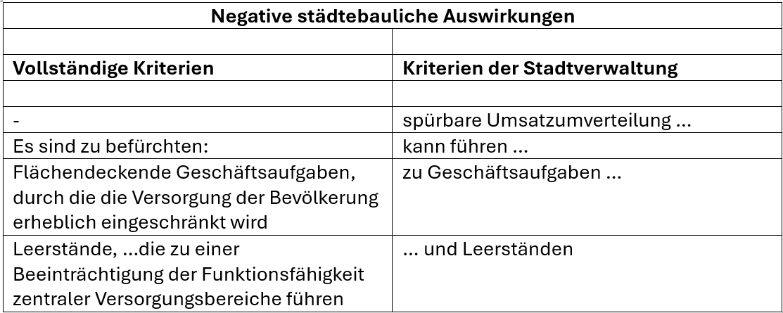 Die Stadtverwaltung widerspricht dieser Schlussfolgerung aber. Sie führt in ihrer Sitzungsvorlage aus: „Anders als der Gutachter kommt die Verwaltung zu dem Ergebnis, dass das Vorhaben zu spürbaren Umsatzumverteilungseffekten führen kann. Diese können … zu strukturellen Auswirkungen in Form von Leerständen und Geschäftsaufgaben an bestehenden Handelslagen im Stadtgebiet führen.“
