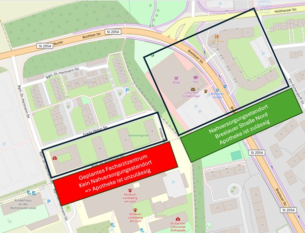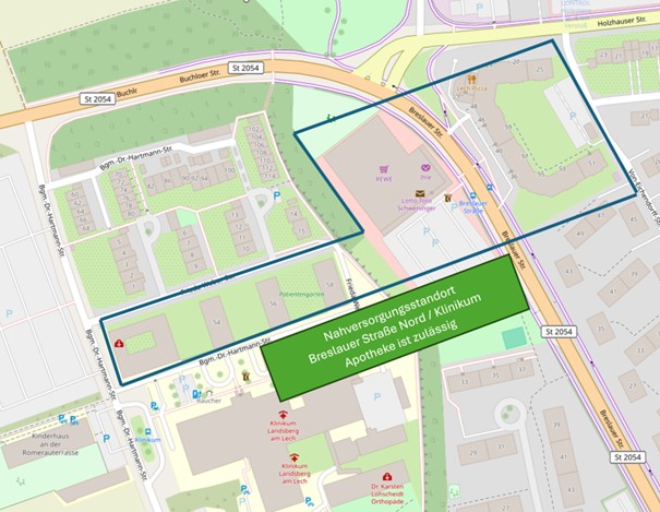 Grundlage ist das am 20. Juli 2022 vom Landsberger Stadtrat beschlossene Einzelhandels-Entwicklungskonzept. Es ordnet die Sortimente einer Apotheke (Arzneimittel, Drogeriewaren) und eines Sanitätshauses (Medizinische und orthopädische Produkte) dem Nahversorgungsbedarf zu. Waren des Nahversorgungsbedarfs dürfen nur im „Zentralen Versorgungsbereich Innenstadt“ sowie in ausgewiesenen "Nahversorgungsstandorten" verkauft werden. Der Bereich um das Klinikum liegt nicht innerhalb eines solchen Gebiets. Das nächstgelegene ist aber in Sichtweite: der „Nahversorgungsstandort Breslauer Straße Nord“:
